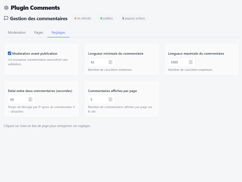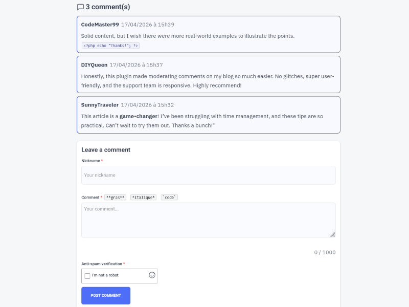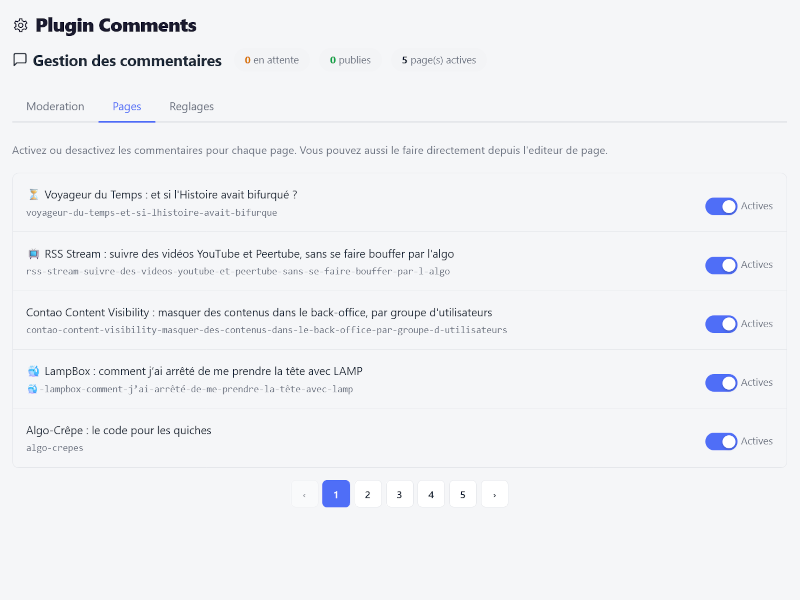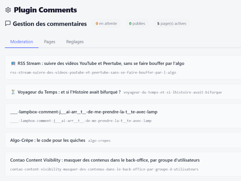 Le besoin de départ était clair : modération, anti-spam sans captcha dégueulasse, protection CSRF, pagination, et la possibilité d'activer ou non les commentaires page par page. Parce que plusieurs articles ne justifient pas des commentaires. Bref. Rien d'exotique sur le papier, mais rien de vraiment disponible non plus.