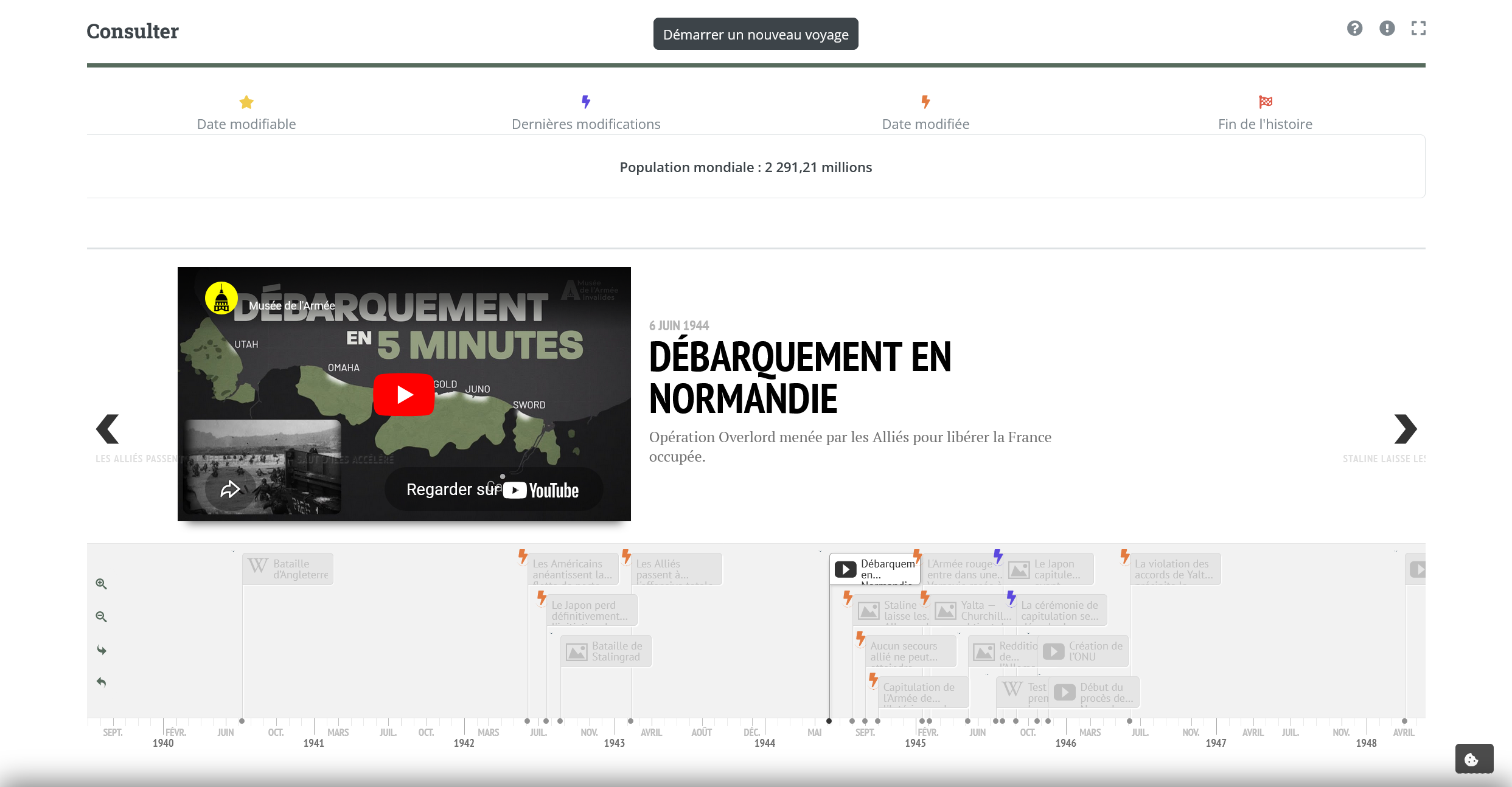 Le projet est donc une plateforme où je propose des récits uchroniques. Plusieurs époques seront à débloquer, mais le premier lot est sur la Seconde Guerre Mondiale. Sur des formats courts, pas sur du roman volumineux. On arrive sur un événement, on capte rapidement le point de divergence... et on s'engouffre dans une part alternative. À la clé, un "score" déterminé par le nombre de vies sauvées/perdues selon les choix effectués.